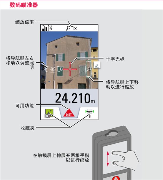徠卡DISTO?D810 是世界上唯一一款帶圖像測量的手持激光測距儀。它在不靠近目標(biāo)的情況下,調(diào)節(jié)D810 touch屏幕上的圖像光標(biāo)就可以進(jìn)行遠(yuǎn)程測量。圖像測量可以直接測量目標(biāo)的,長度、寬度、面積、直徑、周長等。徠卡DISTO?D810具有高精度羅盤、舒適的彩色觸摸屏、四倍數(shù)碼瞄準(zhǔn)器、清晰的數(shù)碼照相功能、鋰電池充電、新一代藍(lán)牙4.0、徠卡Sketch軟件等諸多優(yōu)勢。這些功能讓測距儀不再是個工具而是儀器。