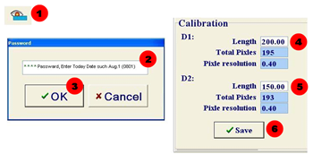 將測微尺放到物鏡下,調整焦距至清晰.  點擊校準圖標,輸入密碼:當日日期,如果是1月2日,則密碼為0102,校準窗口將出現。